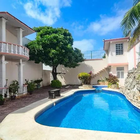 Die 4-Zimmer- Casa Con Alberca Y Amplio Espacio Para Tu Familia verfügt über eine Terrasse mit Blick auf den Pool und ist 10 Autominuten vom Flughafen Playa del Carmen entfernt gelegen.